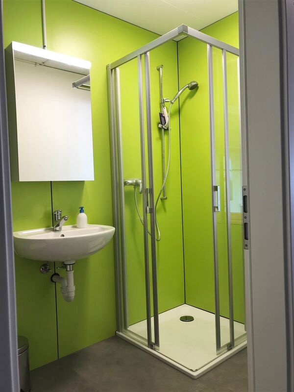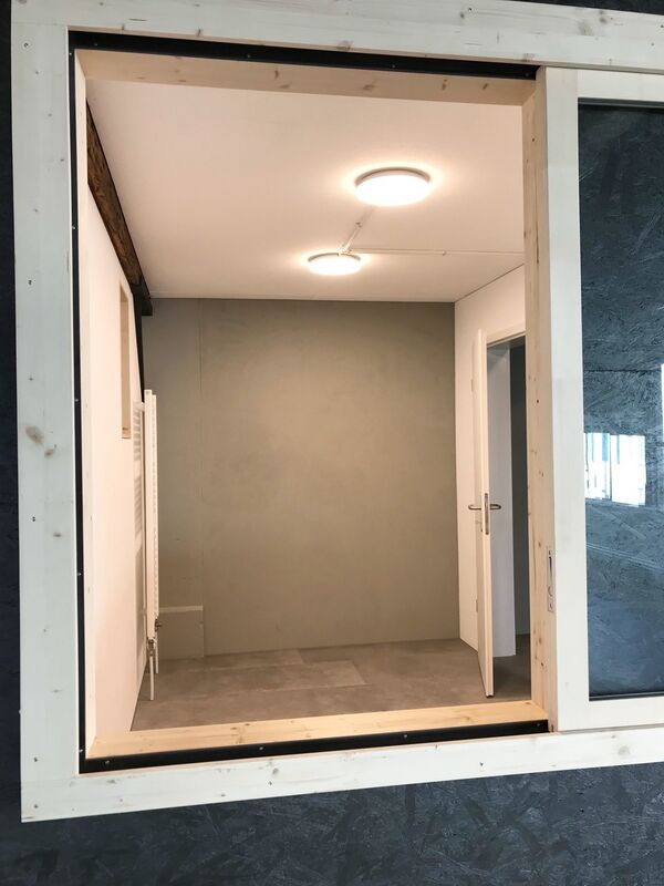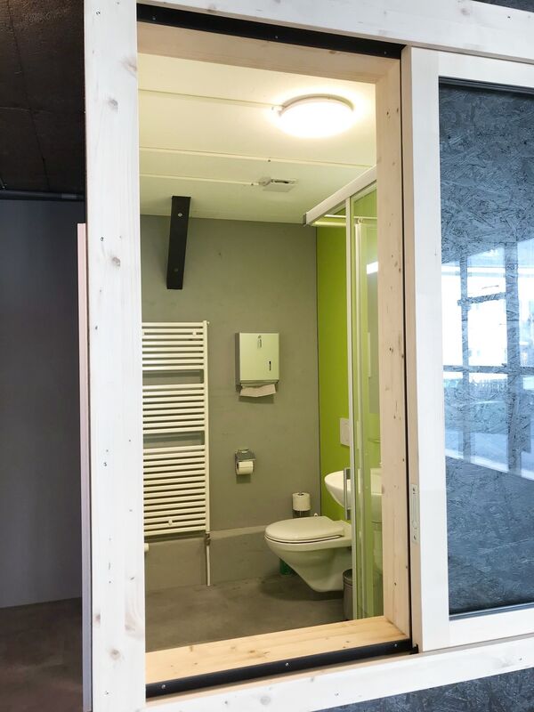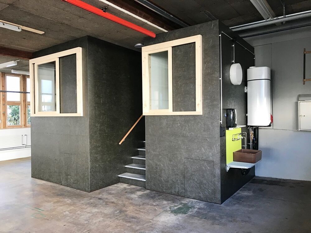 Ein Sanitärbereich befindet sich in der kleineren Box. Die Boxen sind mit Schiebefester versehen, sie können komplett zur Seite geschoben werden. Das Heisswasser wird durch einen Wärmepumpenboiler erzeugt. Die zweite Box eignet sich aktuell für verschiedene Nutzungen. Es könnte jedoch ein zweiter Sanitärbereich darin ausgebaut werden. Auf der Aussenseite der grösseren Box besteht die Möglichkeit einen weiteren Wasseranschluss anzulegen. Der Eingang ist mit einem Rolltor und einer separater Servicetüre gestaltet. Bie Bedarf kann eine Kranbahn an der Decke kann genutzt werden. Der Bodenbelag ist aus Holzzement.