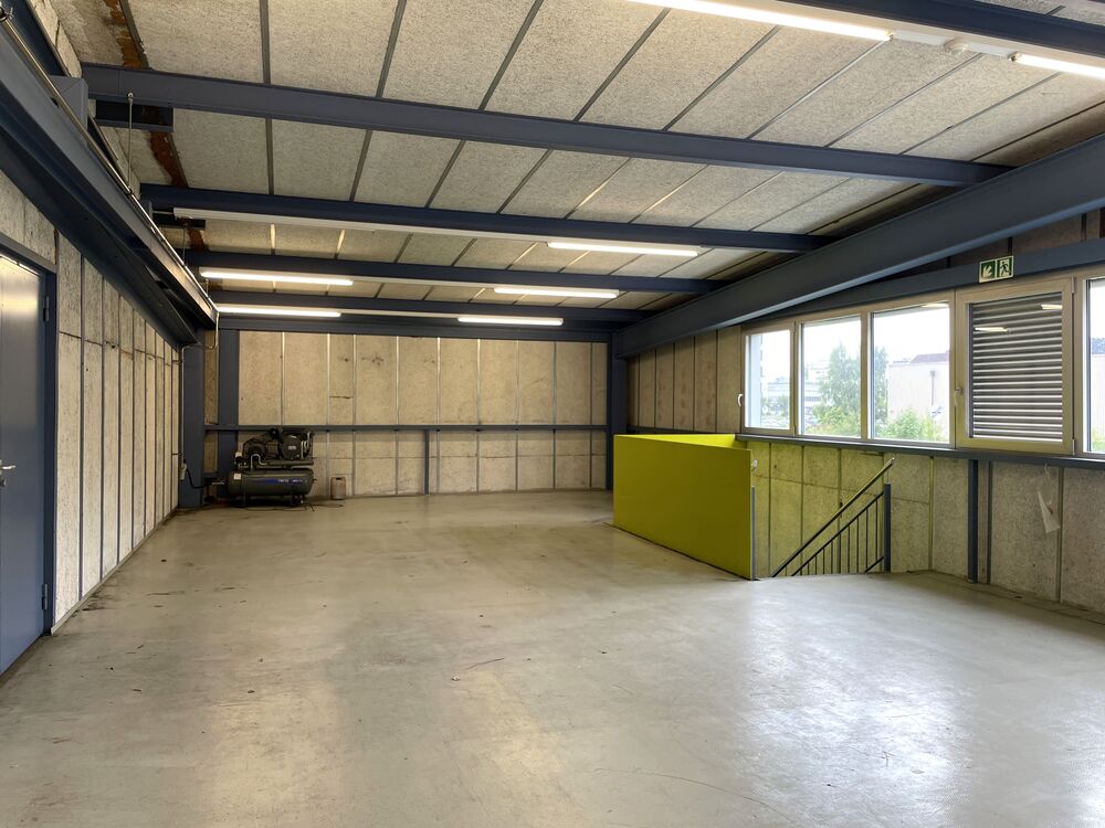 Das Gewerbe verteilt sich auf zwei Stockwerken und bietet zusätzlich grosszügige Aussenflächen mit Lagerplatz, Velounterstand und 8 Parkplätzen.